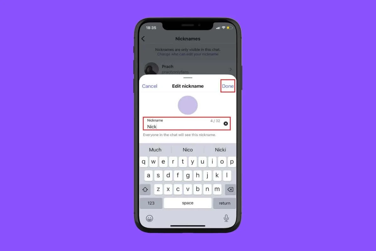 6. Toque listo. Después de guardar su nuevo apodo, haga clic en «Listo».