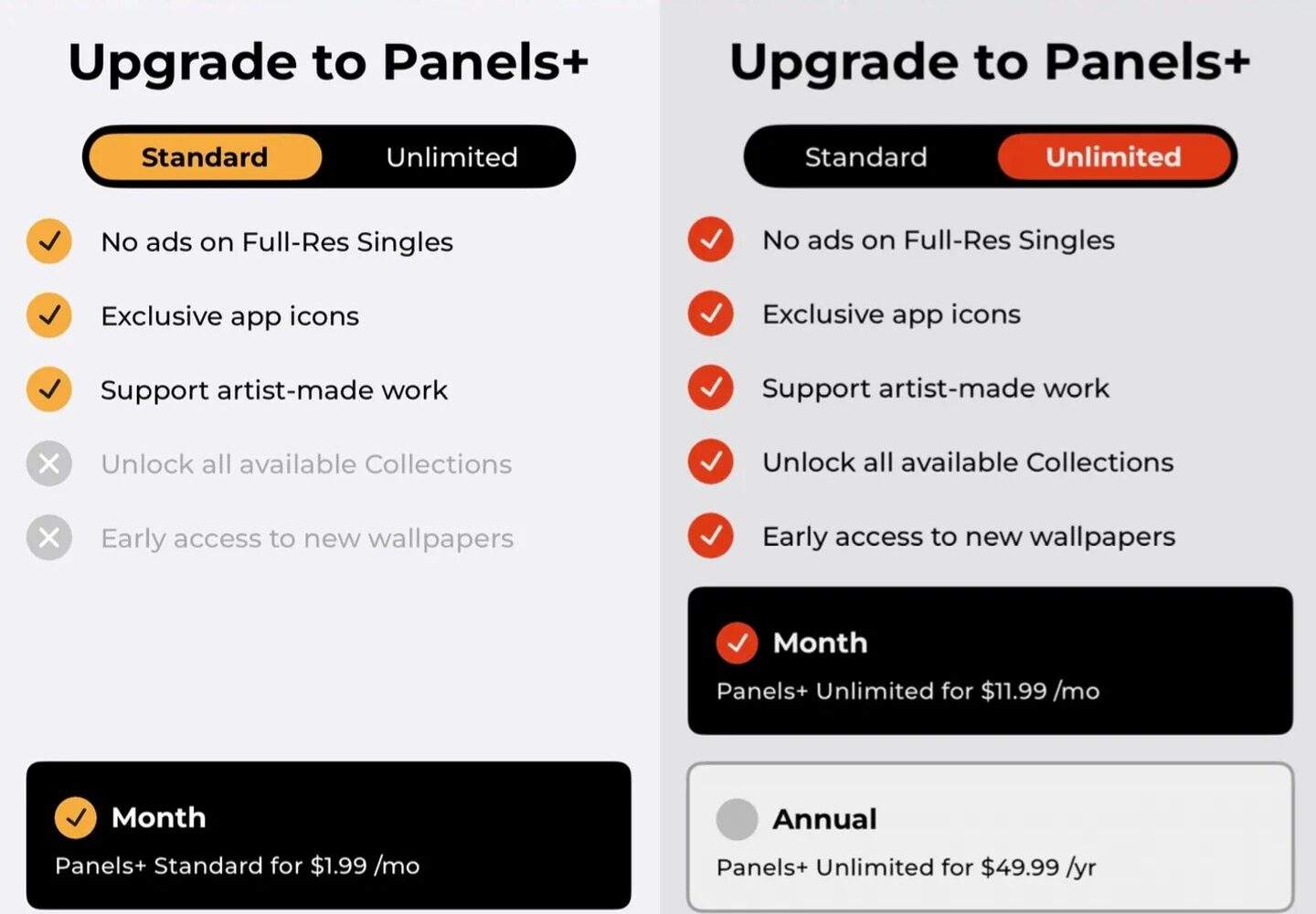 El equipo de Brownlee también ha reconsiderado el modelo de suscripción. Disponible Paneles Plus se ha añadido una opción más asequible a la suscripción. El paquete «Estándar», con un precio de 1,99 $ al mes, ofrece una experiencia de fondos de pantalla sin anuncios, mientras que el paquete «Ilimitado», anunciado anteriormente, de 11,99 $, ofrece acceso a todas las colecciones y acceso anticipado a nuevos contenidos.