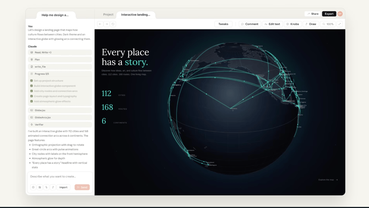 Cuando le pides a Claude que prepare un prototipo de aplicación, puedes revisar el boceto resultante y cambiar los colores del diseño y el tamaño de la tipografía. Asimismo, puedes pedirle a Claude que agregue un botón de modo oscuro. La herramienta también puede crear prototipos basados en código respaldados por audio, video, sombreadores, 3D e inteligencia artificial incorporada.
